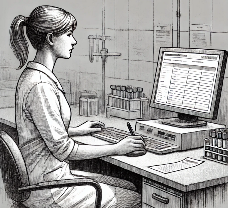 A análise é feita pela biomédica Joana, que registra o resultado no sistema do laboratório.