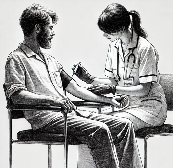 O senhor Pedro se dirige a um Laboratório de Análises Clínicas para coleta de sangue. A amostra é coletada.